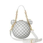 Dettagli orecchie tagliate e cucite da orso, 28" di circonferenza, altezza manico 4,5", può essere indossato a mano o a spalla, maniglia a catena, tracolla rimovibile
