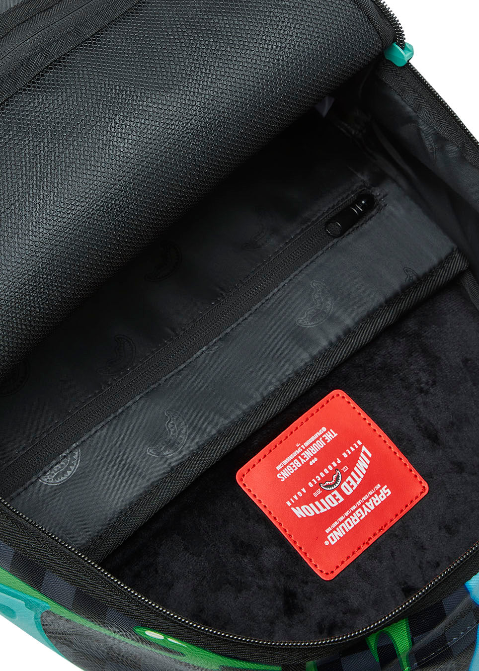 Tasca frontale con cerniera • Tasche laterali • Tasca nascosta con cerniera • Scomparto separato per occhiali da sole in velluto • Imbottitura posteriore ergonomica in rete • Cinghie regolabili per dimensioni personalizzate • Cerniere dorate con hardware in metallo • Badge "Sprayground Authentic" in metallo • La manica posteriore scorrevole si collega al bagaglio a mano per avere le mani libere