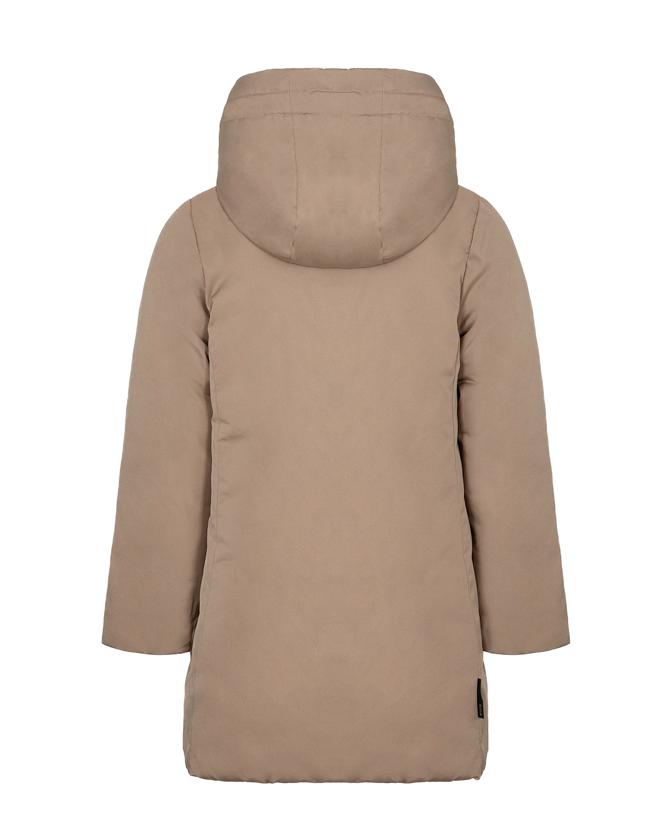 1. Giubbotto lungo color beige con cappuccio regolabile
